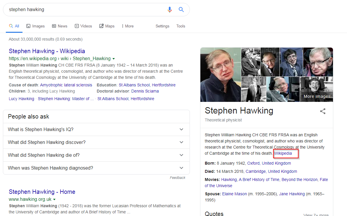 Stephen Hawking entry appearing in the Google Knowledge Panel (drawn partly from Wikipedia)